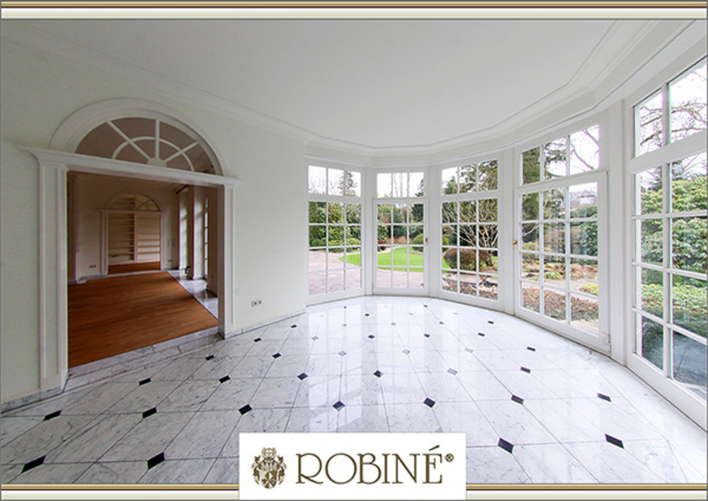 Über das Entree mit angrenzender Garderobe und Gäste-WC gelangen Sie in die großzügige Empfangshalle mit Treppenaufgang und Galerie. Von hier aus betreten Sie den zum Garten ausgerichteten Wohnbereich mit antikem Echtholz-Kamin und Einbauten im Landhausstil. Bodentiefe Sprossenfenster mit Zugang zur Terrasse sorgen für lichtdurchflutete Räume und geben den Blick auf den Garten samt Teichlandschaft frei. Links vom Wohnzimmer befindet sich eine kleine Bibliothek mit hochwertigen Schrankeinbauten und einem traumhaften Ausblick in den Garten. Das geräumige Esszimmer mit Marmorboden und raumhohen Fenstern verspricht ebenfalls eine herrliche Aussicht ins Grüne und bietet viel Platz für gemütliche Abendessen mit Familie und Freunden. Die angrenzende Küche im Landhausstil wurde auf Maß gefertigt und passt sich farblich perfekt an den Marmorboden in klassischer Schachbrett-Optik an.