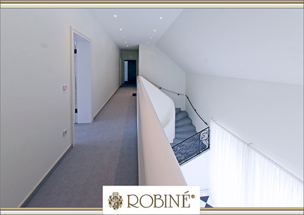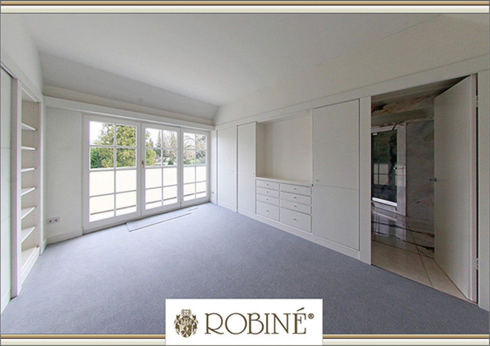 Die Erschließung der Schlafbereiche im Dachgeschoss erfolgt über den Treppenaufgang mit schmiedeeiserenem Geländer in der Empfangshalle. Über die zentrale Galerie im Obergeschoss haben Sie Zugang zu allen Räumen. Das Masterschlafzimmer ist mit hochwertigen, weißen Schrankeinbauten ausgestattet und verfügt über einen angrenzenden Balkon mit Blick in den Garten sowie Zugang zum exklusiven Masterbad in Marmor-Ausstattung mit großer Whirlpool-Wanne, 2 Waschtischen, Duschkabine und geschlossenem WC. Rechter Hand befindet sich ein weiteres Schlafzimmer, welches ebenfalls Zugang zum Masterbad hat und sich somit ideal als zweites Schlafzimmer oder als großzügige Ankleide anbietet. Darüber hinaus stehen noch 2 weitere Schlafzimmer, ebenfalls beide mit Bad en Suite, für den Nachwuchs oder Gäste bereit. Das größere der beiden Kinderzimmer ist sowohl über die Galerie als auch über einen separaten Hauseingang erreichbar und eignet sich somit zum Beispiel perfekt für ältere Kinder, Aupairs oder Bedienstete.